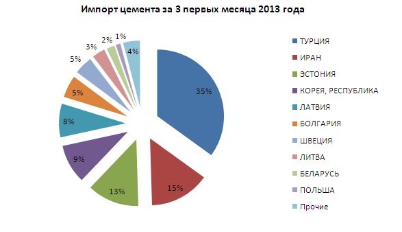 Согласно данным Федеральной Таможенной Службы суммарный импорт цемента* за три первых месяца 2013 года составил 696 529,00 тонны. Основной страной импортером традиционно стала Турция с отгрузкой около 244 тысяч тонн, а вот на второе место переместился Иран, резко увеличив ввоз цемента в Россию, объем которого превысил 100 тысяч тонн. Эстония опустилась на третье место с объемом 88 тысяч тонн.